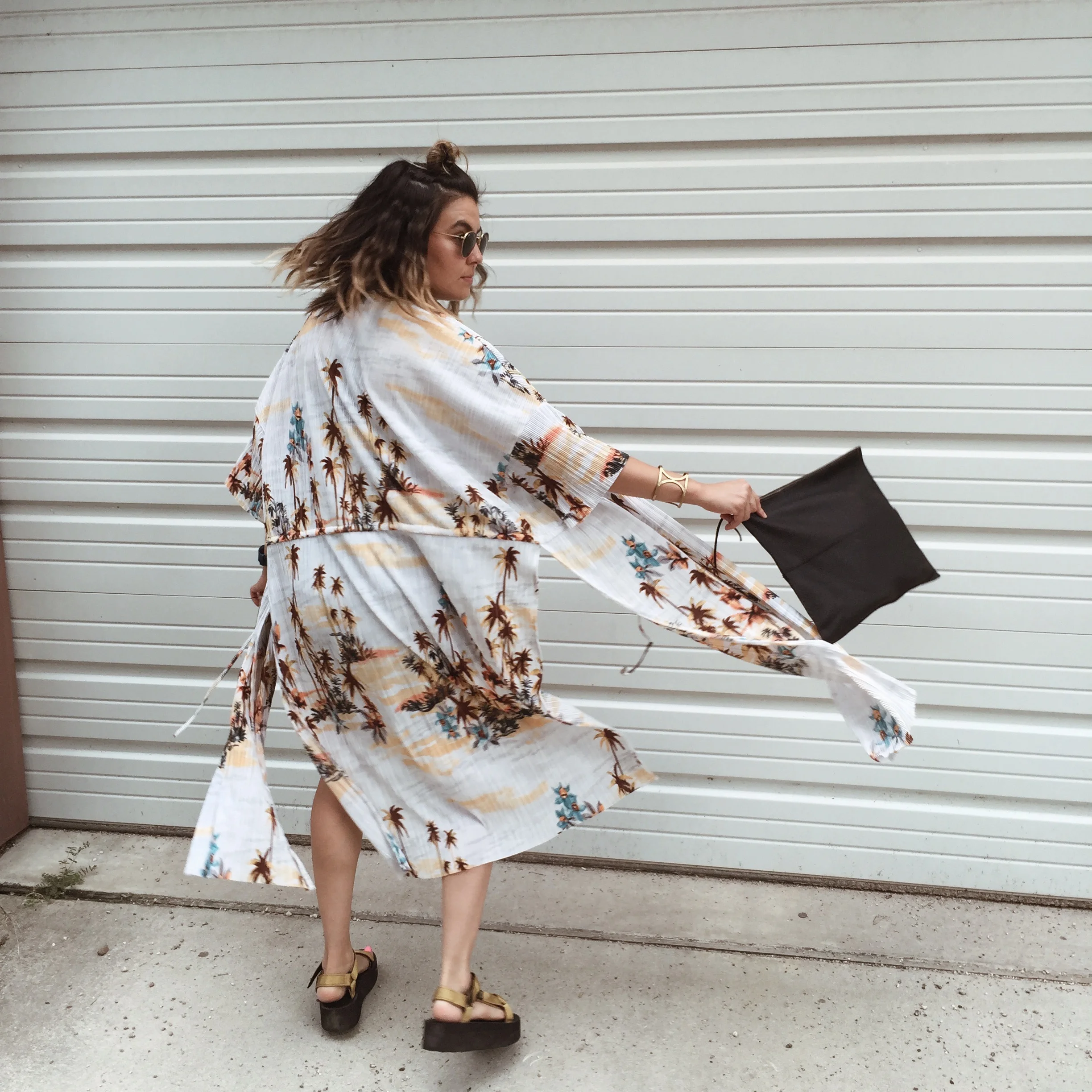 Kimono /// Bag /// Flatforms /// Bangel /// Sunnies /// Fitbit /// Tank /// Shorts